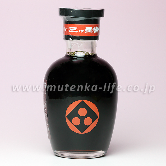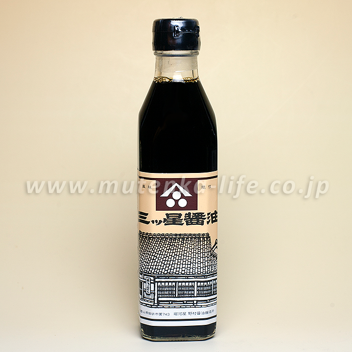 「日本の醤油のルーツは紀州」だとする説があります。300年の歴史を持つ「三ツ星醤油」は、まさに、紀州醤油の“生一本”。国内産の丸大豆と小麦をもちい、昔ながらの製法で天然もろみを搾った濃口醤油です。何から何まで人手をとおして丹精した、すばらしい香りと味。そのままお刺身やお漬物、湯豆腐などにお使いになると、なお一層、真価がご堪能いただけます。生のままの醤油のうまさこそ、まさに、「本物」の証です。