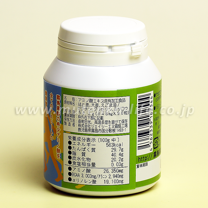 | 栄養成分 | 熱量563kcal、タンパク質29.7g、脂質40.4g、炭水化物20.2g、食塩相当量0.03g、アミノ酸26,350mg、BCAA3,003mg、アラニン2,940mg、αリノレン酸19,100mg(100g中) ※製品は1粒648mg球です。 |