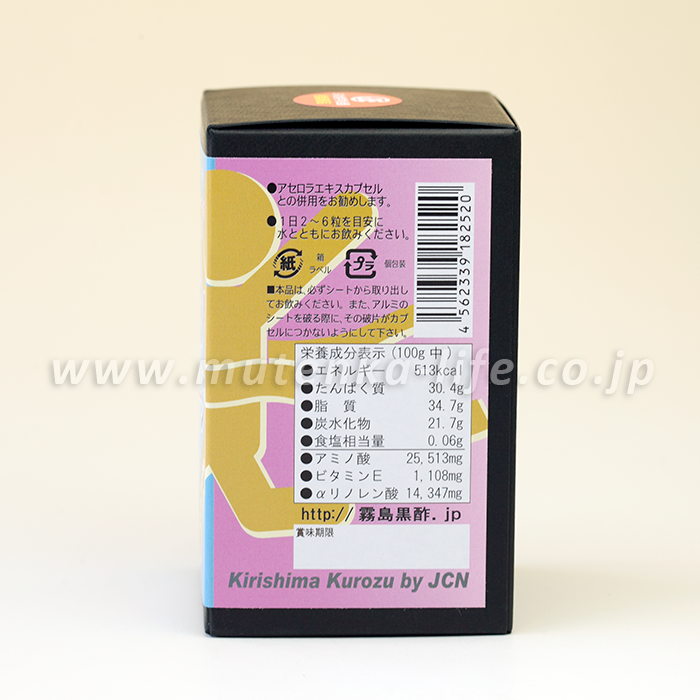 | 栄養成分 | エネルギー513kcal、タンパク質30.4g、脂質34.7g、炭水化物21.7g、食塩相当量0.06g アミノ酸25,513mg、ビタミンE1,108mg、αリノレン酸14,347mg(100gあたり) |