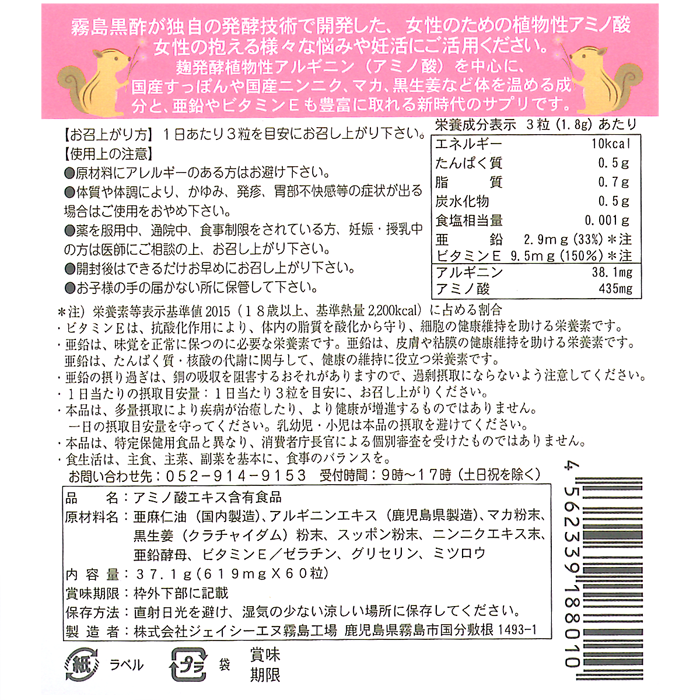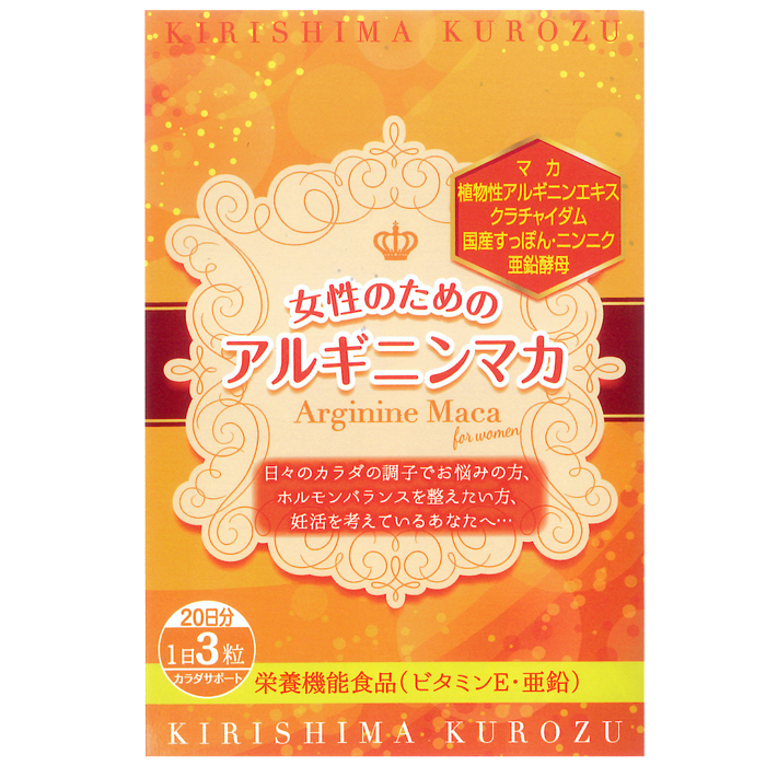 | 原材料 | 亜?仁油(国内製造)、アルギニンエキス(?児島県製造)、マカ粉末、??姜(クラチャイダム)粉末、スッポン粉末、ニンニクエキス末、亜鉛酵?、ビタミンE/ゼラチン、グリセリン、ミツロウ |